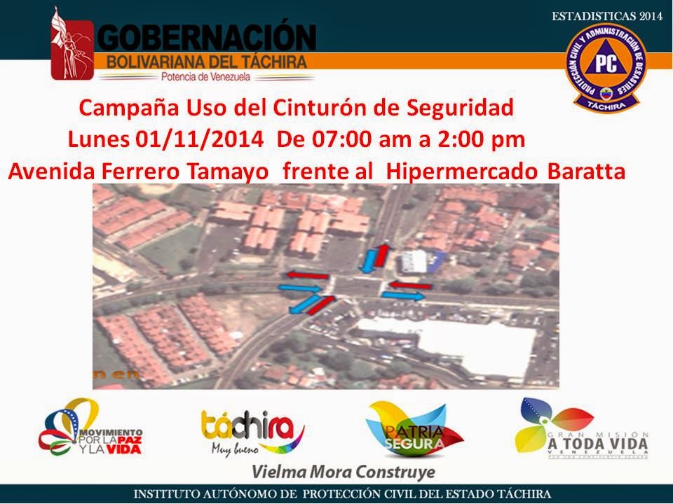 Para resaltar que la campaña se estará realizando en las principales arterias viales de la ciudad de San Cristóbal lo que será la Av. España, Av. Carabobo, Av. Ferrero Tamayo, 5ta y 7ma avenida, con un gran contingente de hombre y mujeres de los diferentes organismos participantes.